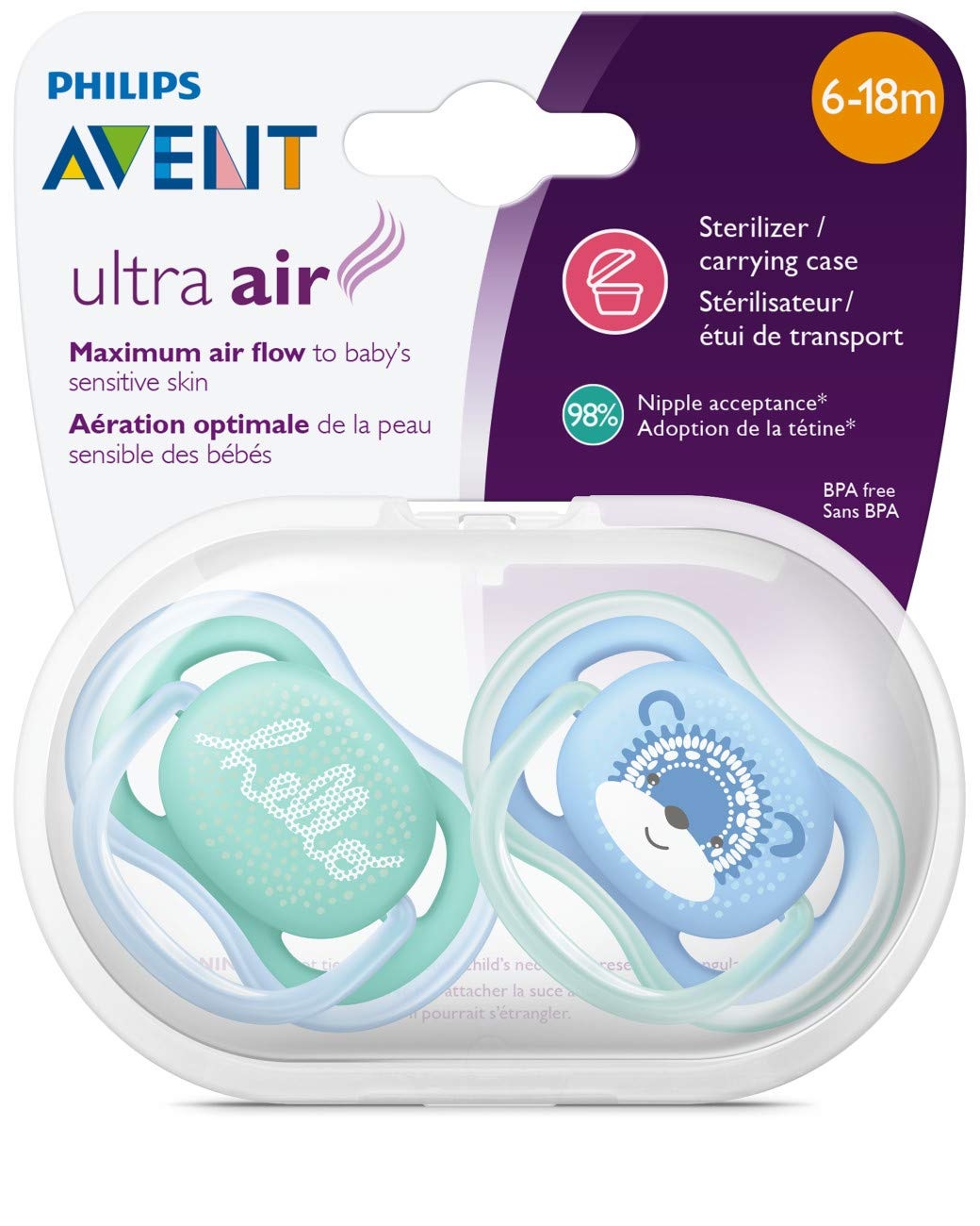 Uma chupeta leve e com aberturas de ar para a pele sensível do bebê Grandes aberturas para permitir que a pele do bebê respire. Deixe a pele do seu bebê respirar com a Chupeta Philips Avent Ultra Air, que possui 4 grandes aberturas e um escudo leve desenhado para o o máximo de fluxo de ar, para que a pele do bebÊ continue seca enquanto usa a chupeta.