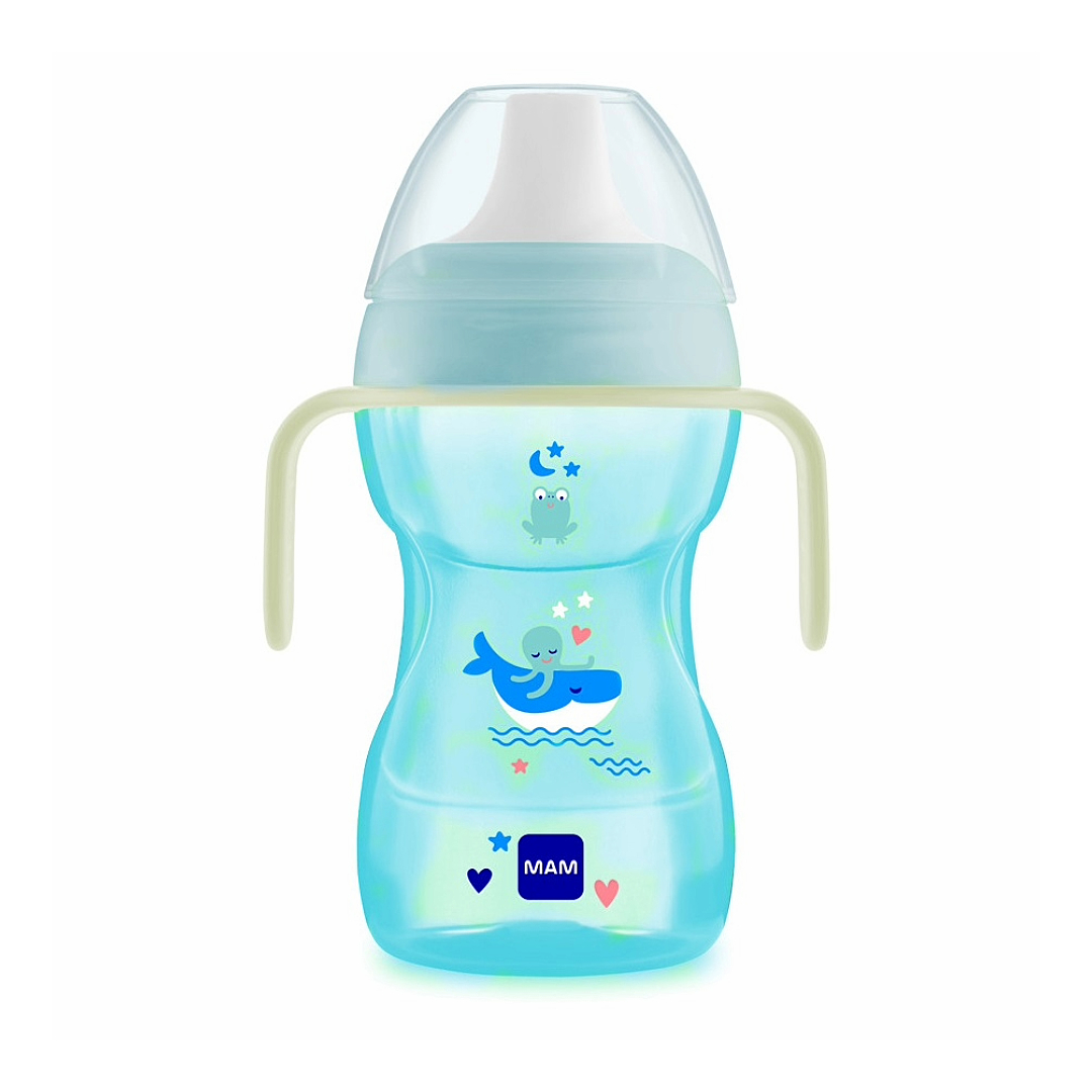 Combinando o design e funcionalidade tradicionais da linha MAM, Fun to Drink Night é ideal para ajudar os pequenos na transição do copo treino para os copos comuns.