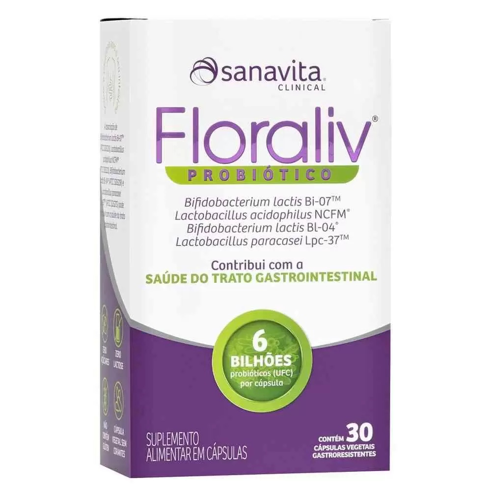 Floraliv Probiótico é um suplemento composto por um mix de 4 probióticos (Lactobacillus acidophillus NCFM, Lactobacillus paracasei Lpc-37, Bifidobacterium lactis Bi-07 e Bifidobacterium lactis Bl-04), combinados em alta concentração para te ajudar a manter uma flora intestinal saudável, contribuindo para a saúde gastrointestinal e outros benefícios para o seu corpo.