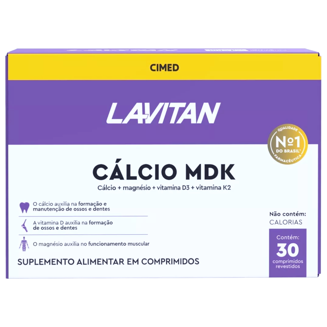 Lavitan Cálcio MDK é um suplemento alimentar de Vitaminas e Minerais em comprimidos revestidos. O cálcio auxilia na formação e manutenção de ossos e dentes. A vitamina D auxilia na formação de ossos e dentes. O Magnésio auxilia no funcionamento muscular. A vitamina K auxilia na manutenção dos ossos.